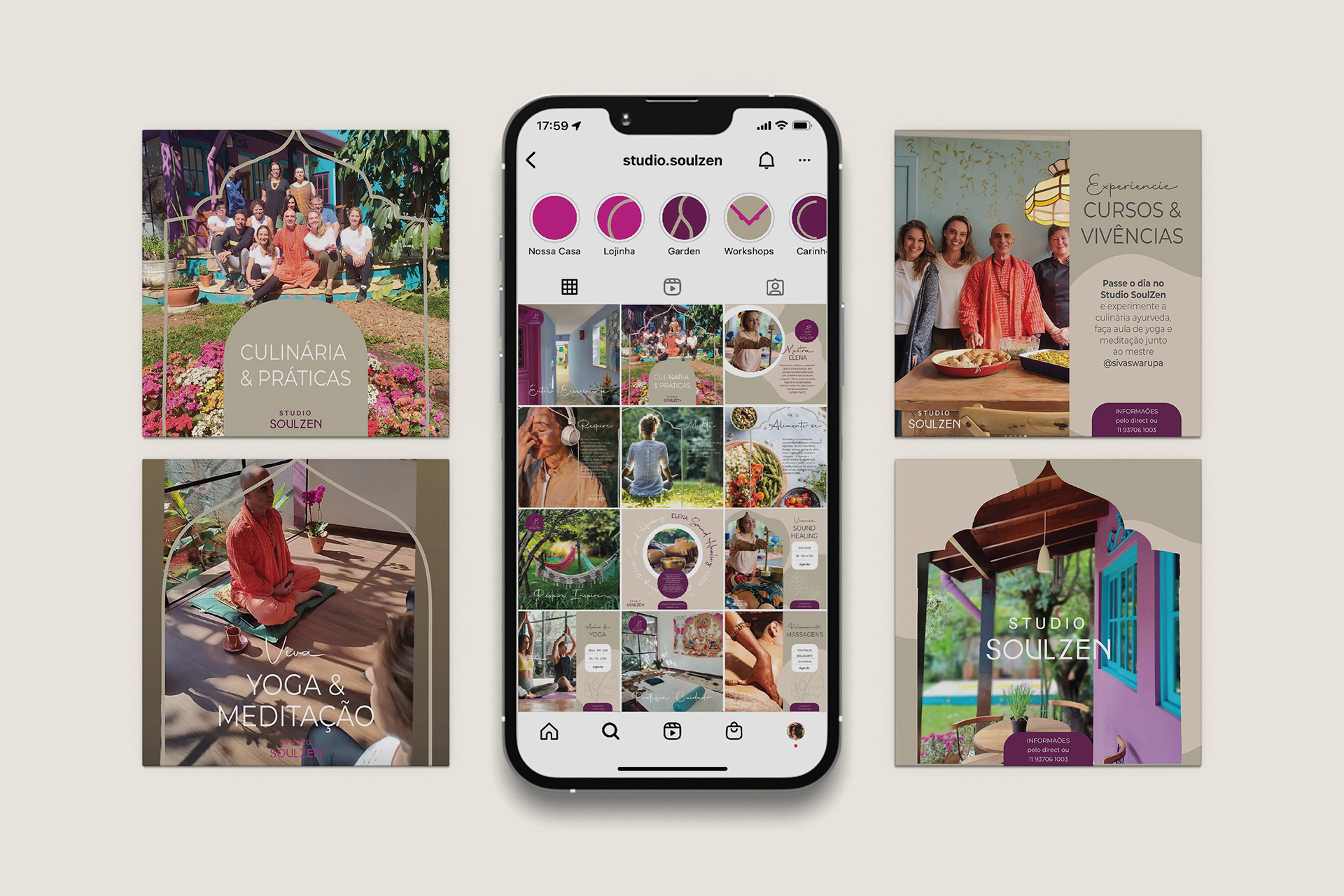 Para as mídias sociais da SoulZen, foi criada uma comunicação gráfica que reforça a identidade da marca, utilizando traços inspirados em desenhos e ambientes indianos, com formas fluidas e orgânicas. Os traços levemente curvos conferem movimento e delicadeza, mantendo a presença marcante da marca.